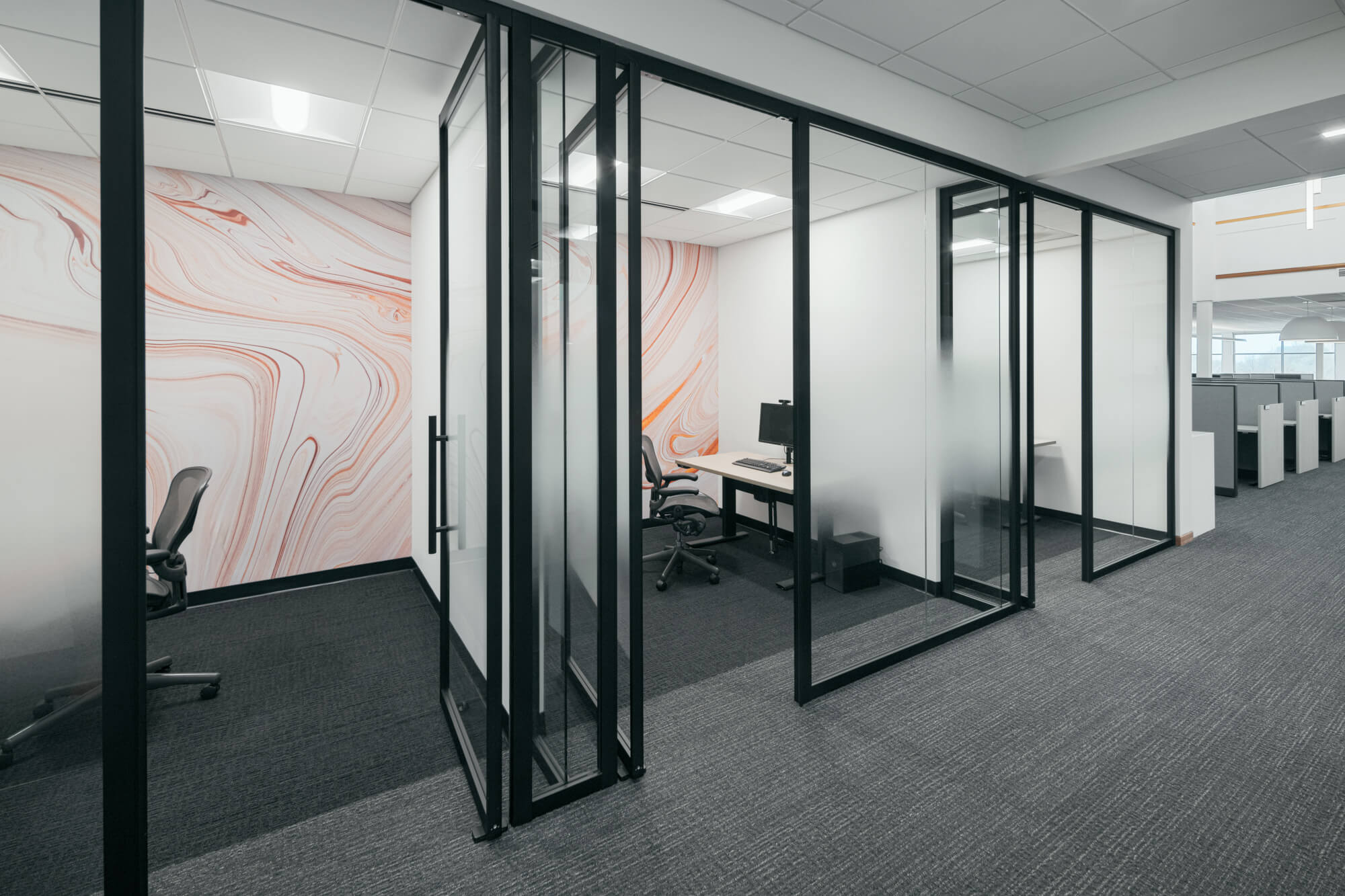 “We had a lot of back and forth with the gradient film for the different conference rooms, and they were great,” he says of the commercial interior glass walls. “We’d look at the samples together, there was that attention to detail that we do with our clients that we really appreciate being on the other side of that equation. The communication was outstanding.”