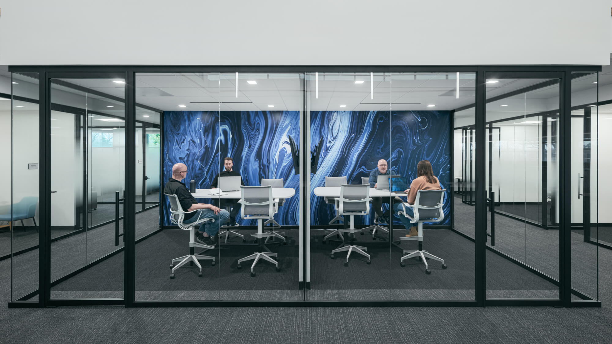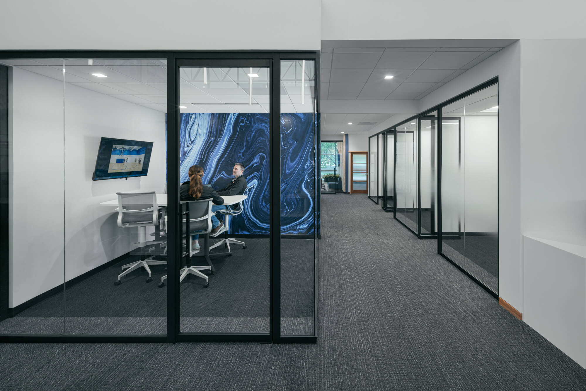 When Iconica, a design-build company in Madison, Wisconsin, set out to revamp their 1998 office building and create a mini showroom for their clients, they asked the local Falkbuilt Branch, Meso, to bid on the project. Not only was Digital Component Construction less expensive, “it was a superior product and great customer service,” says Steve Carbin of Iconica’s Architecture + Interiors team. Meso’s list of products included Kai glass walls and doors (Falkbuilt), customer corner-wrapped Float and Wall2Wall glassboards (Clarus), and customer printed gradient decorative window films (NuVision).