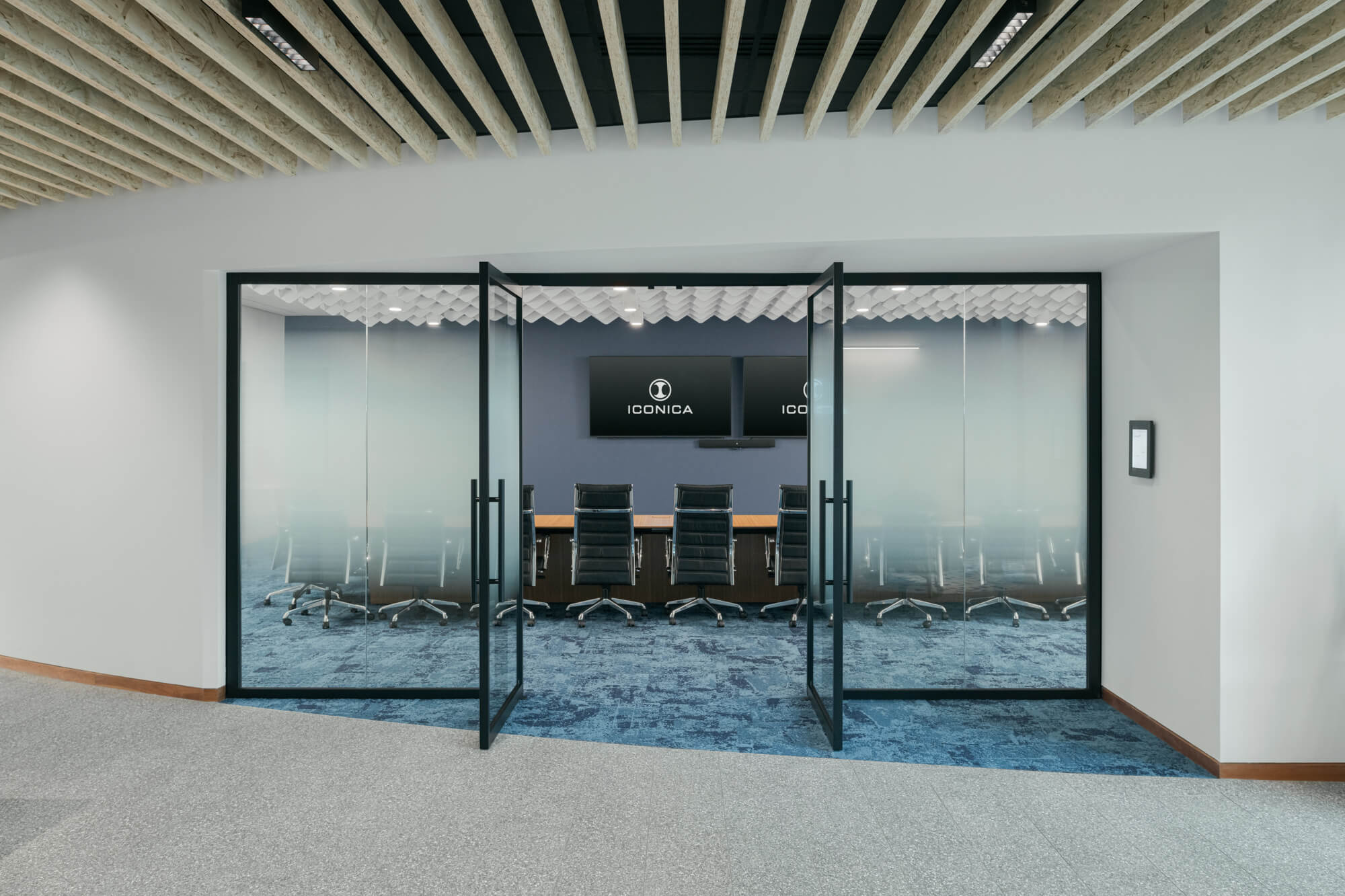 Powered by Echo technology, the Iconica and Falkbuilt teams both used Autodesk Revit software in the design stage, making coordination a breeze. Steve was open to a suggestion to replace transoms above standard-height doors with full-height, 9’0” doors in all of the interior glass partitions provided by Meso. Being in the design-build construction business, providing full architectural, engineering, and general contracting services, the Iconica team was delighted with the change to the interior glass doors.