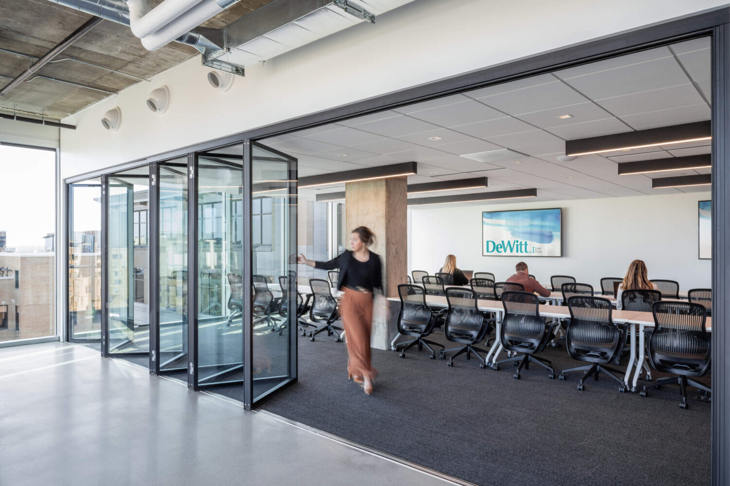 With incredible views from their space on the eighth and ninth floors, DeWitt and their project team found it impactful to incorporate glass wall solutions and interior glass doors to improve acoustics, aesthetics, and consistency throughout their private offices, conference space, and boardroom.