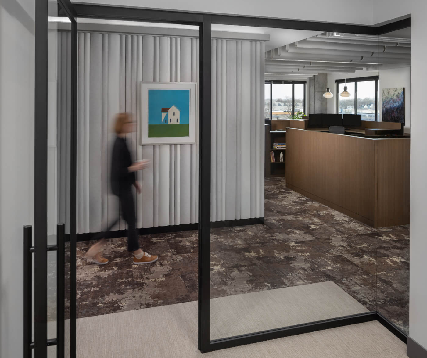 To continue the aesthetic and maximum light transfer, Destree utilized the same Kai glass fronts for the front entry into their suite. Meso and Falkbuilt were able to incorporate unique secure entrance hardware to coordinate with the building standard.