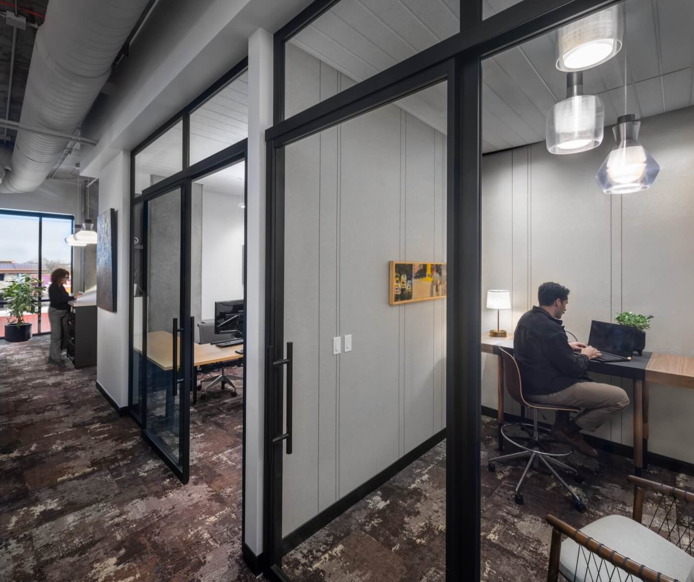 Falkbuilt Kai glass fronts allowed Meso to maximize the glass size accommodated within the frames, giving Destree as much natural light transfer as possible. The extra-large glass panes were lifted by crane from ground level to the third-floor space.